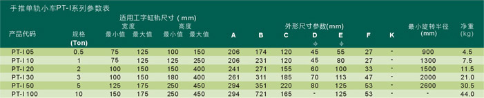 艾培爾PT-1型安全型手推單軌小車參數(shù):