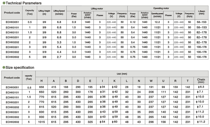 艾培爾ECHK運(yùn)行式電動(dòng)葫蘆參數(shù):