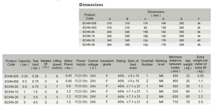 艾培爾ECHN單相電動葫蘆參數(shù):