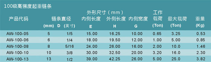 艾培爾AW-8型80級(jí)高強(qiáng)度起重鏈參數(shù):
